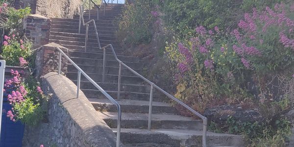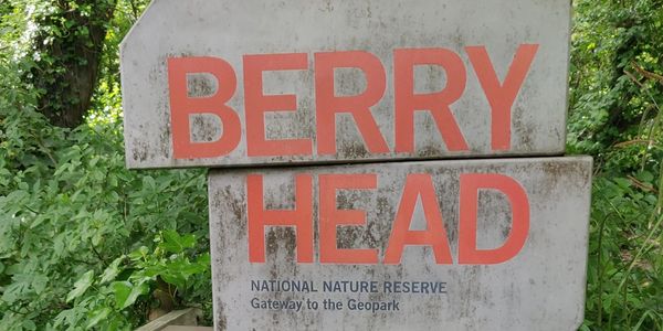 After passing the outdoor pool and the carpark you will have to take a left and follow the road a short distance past Berry Head Hotel before going left into the woods (at the sign - shown here). If you do not want to do steps just carry on 20m and take a left instead.